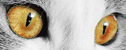 Détourez les yeux en utilisant l’outil de sélection Polygone ou la baguette magique. Ici, nous utiliserons la baguette magique avec une tolérance de 80. Un premier clic sur l’œil de gauche sélectionne pratiquement tout l’iris. Un deuxième clic avec la touche Contrôle maintenue enfoncée termine la sélection du premier iris. Nous cliquons maintenant sur le deuxième œil, toujours en maintenant la touche Contrôle enfoncée. Ici aussi, deux clics seront nécessaires pour sélectionner tout l’iris du deuxième œil :