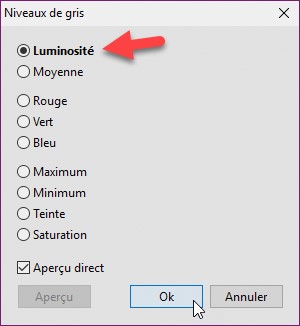 Cliquez sur l’icône Niveau de gris pour désaturer l’image. La boîte de dialogue Niveau de gris s’affiche. Vérifiez que l’option Luminosité est sélectionnée et cliquez sur OK :