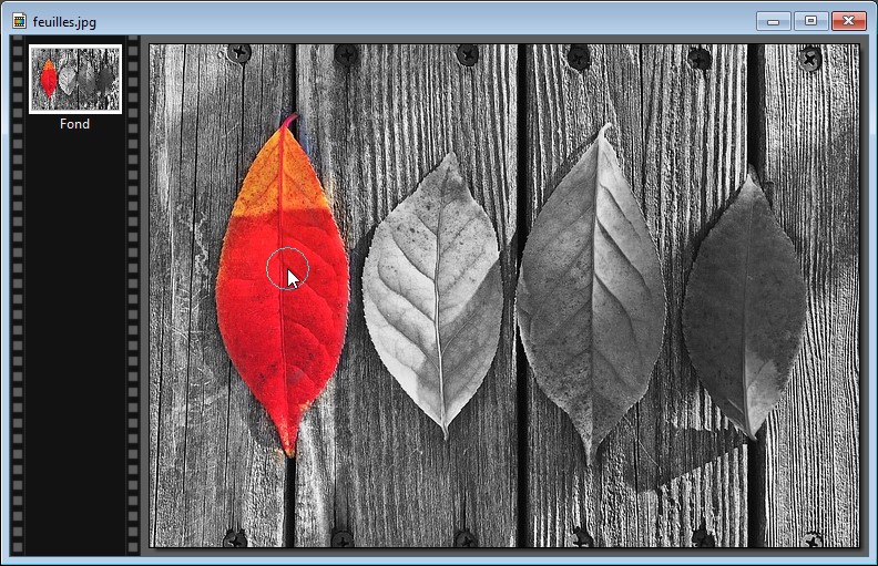 Dans la palette d’outils, sélectionnez l’outil Tampon de clonage. Vous pouvez aussi appuyer sur la touche T du clavier pour sélectionner cet outil. Cochez la case Motif et laissez les autres cases décochées. Choisissez le rayon de l’outil de clonage dans la zone de texte Rayon, maintenez le bouton gauche de la souris enfoncé et passez la souris sur la zone à coloriser. Ici par exemple, nous redonnons ses couleurs à la première feuille :