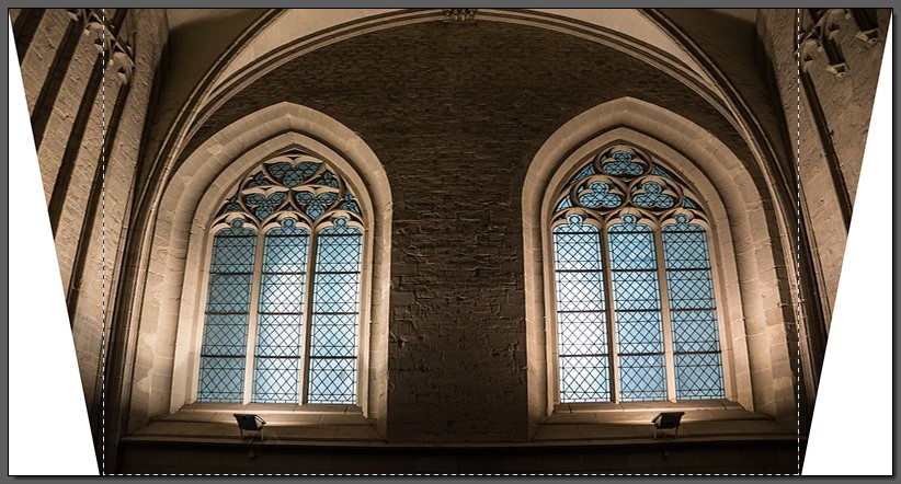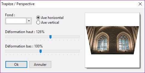 Pour passer de la première à la deuxième, développez le menu Image, pointez l’entrée Transformation et cliquez sur la commande Trapèze / Perspective. La boîte de dialogue Trapèze Perspective s’affiche. Sélectionnez l’option Axe horizontal et agissez sur les curseurs Déformation haut et/ou Déformation bas pour obtenir la correction de perspective désirée dans la zone de prévisualisation. Cliquez alors sur OK pour appliquer cette correction à la photo :