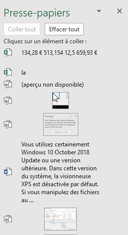 Lorsque vous utilisez la commande Couper ou Copier (ou les raccourcis clavier équivalents), la sélection est empilée dans le presse-papiers multiple. Pour coller l’un des éléments empilés, il vous suffit alors de cliquer sur une cellule dans le classeur et de sélectionner l’entrée correspondante dans le volet Presse-papiers.
