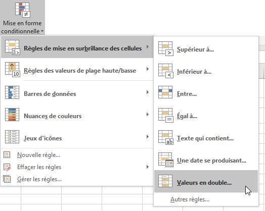 Sous l’onglet Accueil, dans le groupe Styles, cliquez sur l’icône Mise en forme conditionnelle, pointez l’entrée Règles de mise en surbrillance des cellules puis cliquez sur Valeurs en double :