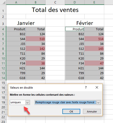 Les doublons sont colorés et la boîte de dialogue Valeurs en double s’affiche. Pour faciliter la lecture, sélectionnez uniques dans la liste déroulante et cliquez sur OK :