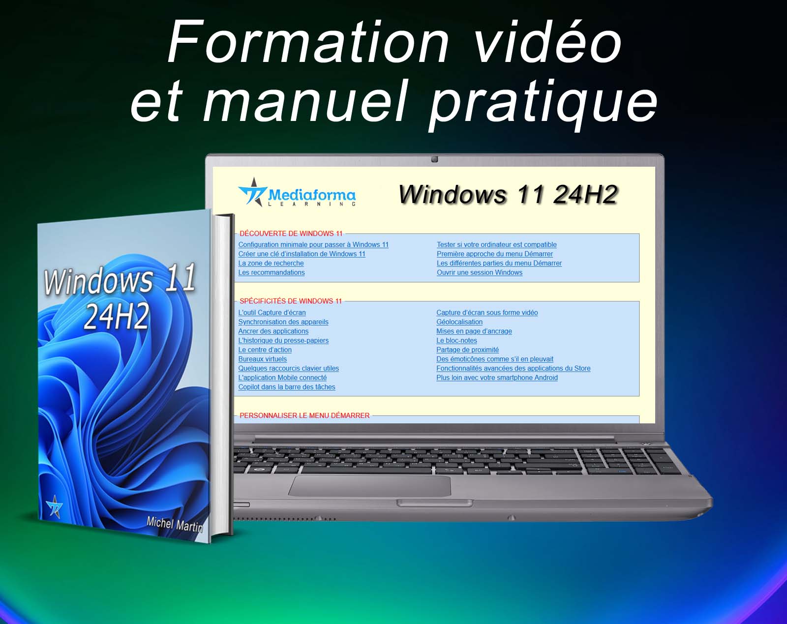 Cette formation vidéo très complète couvre tout ce que vous devez savoir pour tirer le maximum de Windows 11 24H2. Les vidéos vont directement à l’essentiel. Elles sont toujours très progressives, ce qui permet à tout le monde d’appliquer ce qui est présenté. Le manuel illustré qui accompagne la formation est une aide supplémentaire pour vous seconder dans la mise en œuvre des très nombreuses techniques abordées dans la formation vidéo.