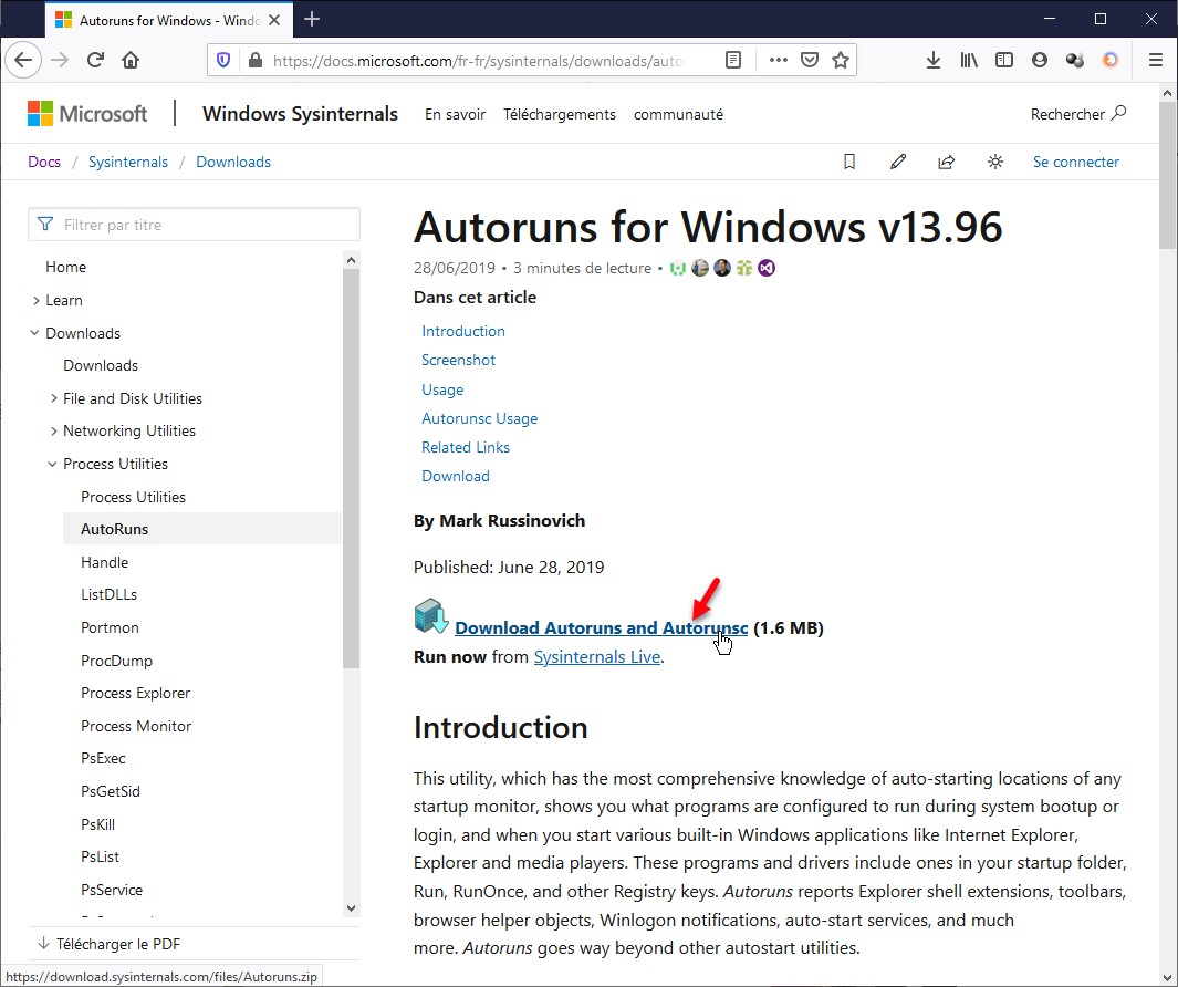 Rendez-vous sur la page https://docs.microsoft.com/fr-fr/sysinternals/downloads/autoruns. Cliquez sur Download Autoruns and Autorunsc :
