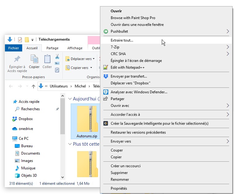 Une fois le fichier ZIP téléchargé, dézipez-le. Pour cela, ouvrez l’explorateur de fichiers, affichez le dossier Téléchargements, cliquez du bouton droit sur son icône et sélectionnez Extraire tout dans le menu contextuel :
