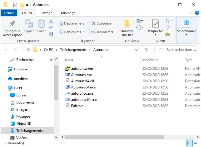 Une boîte de dialogue s’affiche. Cliquez sur Extraire. Quelques instants plus tard, Autoruns a été décompressé dans le dossier Autoruns :