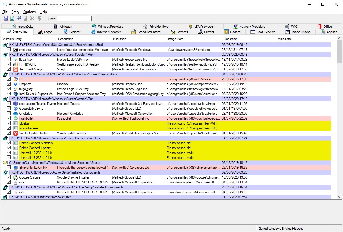 La fenêtre de l’application Autoruns s’affiche. Tous les programmes lancés au démarrage apparaissent dans cette fenêtre, sous l’onglet Everything :