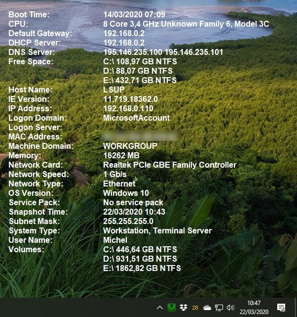 Ce que je vous propose dans cet article, c’est d’afficher les informations dont vous avez besoin sur l’arrière-plan de l’ordinateur pour obtenir quelque chose comme ceci :