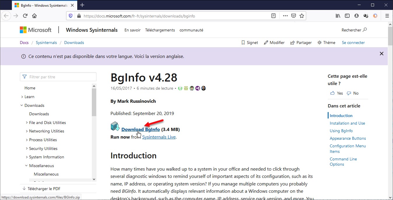 Rendez-vous sur la page https://docs.microsoft.com/fr-fr/sysinternals/downloads/bginfo et téléchargez l’outil BgInfo de Mark Russinovich :