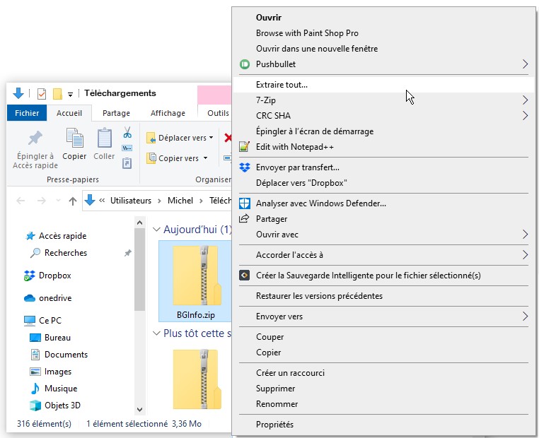 Une fois le fichier ZIP téléchargé, dézipez-le. Pour cela, ouvrez l’explorateur de fichiers, affichez le dossier Téléchargements, cliquez du bouton droit sur son icône et sélectionnez Extraire tout dans le menu contextuel :