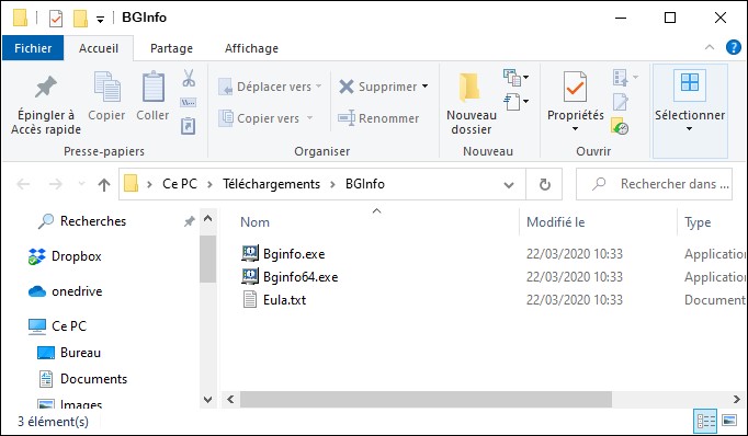 Si vous utilisez une version 64 bits de Windows 10, double-cliquez sur Bginfo64.exe. Si vous utilisez une version 32 bits de Windows 10, cliquez sur Bginfo.exe.
