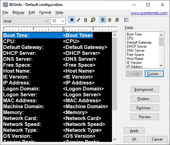 La partie gauche de la fenêtre BGInfo dresse la liste des éléments qui seront affichés sur l’écran. Vous pouvez les éditer comme bon vous semble. Si nécessaire, utilisez la zone de liste de droite pour ajouter une ou plusieurs informations sur l’écran. Cliquez sur OK pour valider l’affichage.
