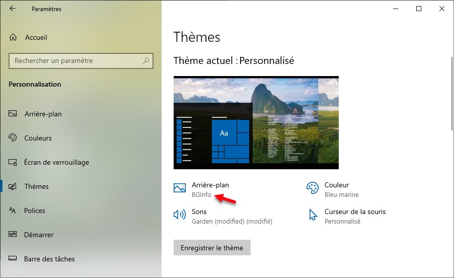 Cliquez sur Démarrer puis sur Paramètres. La boîte de dialogue Paramètres Windows s’affiche. Cliquez sur Personnalisation puis sélectionnez l’onglet Thèmes. Comme vous pouvez le voir, l’arrière-plan par défaut est celui de BgInfo :