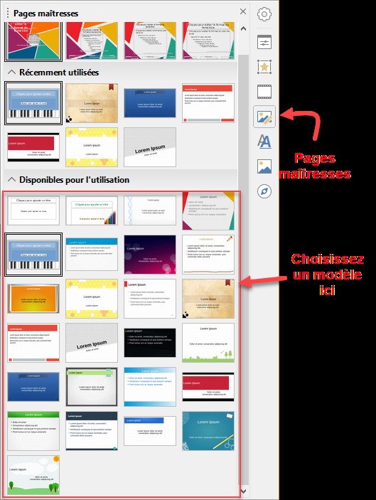Sélectionnez les diapositives concernées par le changement de modèle, basculez sur l’onglet Pages maîtresses dans le volet latéral et désignez le modèle à utiliser :