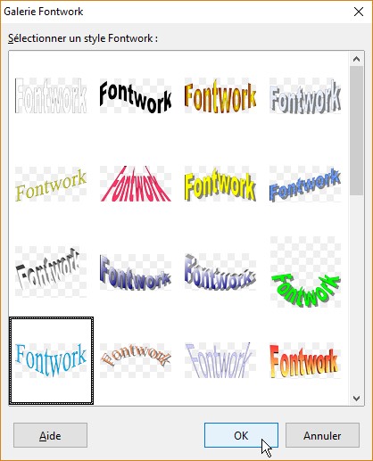 Pour insérer un effet typographique dans une diapositive, lancez la commande Fontwork dans le menu Insertion ou cliquez sur l’icône Fontwork dans la barre d’outils Standard. La boîte de dialogue Galerie Fontwork s’affiche. Sélectionnez un des effets proposés et cliquez sur OK pour l’insérer dans la diapositive :