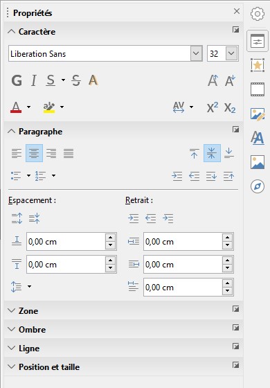 L’icône Propriétés donne accès à un volet qui regroupe les propriétés de l’élément sélectionné (zone de texte, image, diapositive, etc.) :