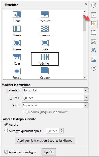 L’icône Transition permet de choisir ou de modifier les transitions entre les diapositives sélectionnées dans le volet Diapos. Vous pouvez choisir une transition, sa durée, le son émis et l’évènement qui déclenche le passage à la diapositive suivante :
