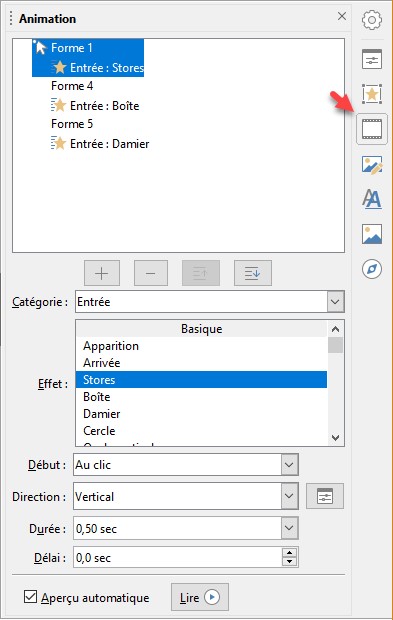 L’icône Animation permet d’ajouter des animations sur les objets sélectionnés. Vous pouvez choisir un effet, sa durée, le délai avant déclenchement et le facteur déclencheur :