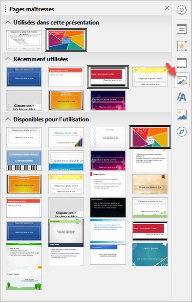 Pour appliquer une page maîtresse à toutes les diapositives d’une présentation, cliquez sur une diapositive dans le volet Diapos, puis appuyez sur Contrôle + A. Choisissez alors une page maîtresse dans le volet latéral :