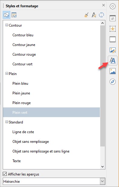 L’icône Styles et formatage donne accès à quelques styles de mise en forme, classés par catégories. Pour appliquer un style à l’objet sélectionné, double-cliquez dessus :