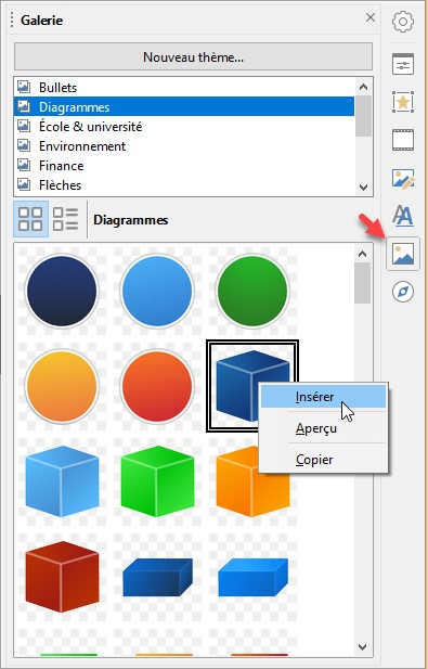 L’icône Galerie donne accès à une galerie de cliparts. Pour insérer l’un d’entre eux dans la diapositive en cours, sélectionnez une catégorie dans la première zone de liste, cliquez du bouton droit sur le clipart à insérer dans la seconde et sélectionnez Insérer dans le menu contextuel :