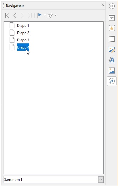 L’icône Navigateur vous permet de vous déplacer dans les diapositives de la présentation en cours d’édition. Pour atteindre une diapositive, il suffit de cliquer sur son nom :