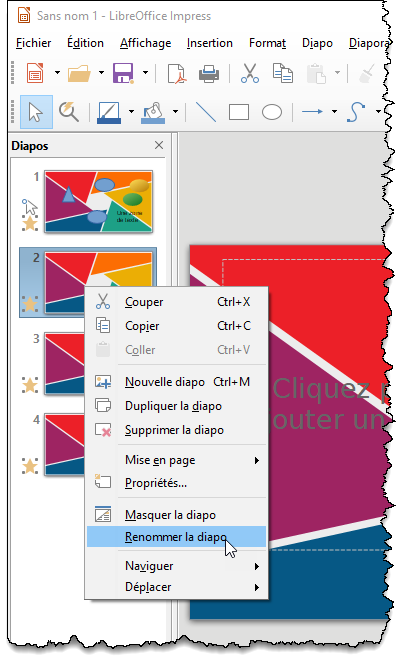 Pour faciliter l’accès à certaines diapositives clés, vous pouvez les renommer. Dans le volet Diapos, cliquez du bouton droit sur la diapositive à renommer et sélectionnez Renommer la diapo dans le menu :