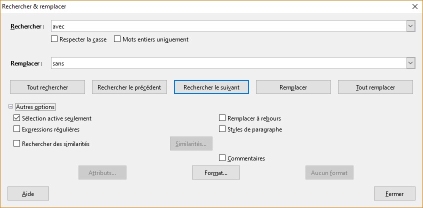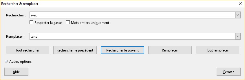 Pour remplacer un texte par un autre, lancez la commande Rechercher et remplacer dans le menu Edition ou appuyez sur Contrôle + H. La boîte de dialogue Rechercher et remplacer s’affiche. Entrez le texte recherché dans la zone de texte Rechercher et le texte de remplacement dans la zone de texte Remplacer :
