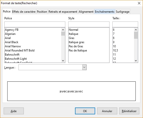 Utilisez les onglets de cette boîte de dialogue pour rechercher une police, un effet de caractère (couleur de police ou de surlignage, soulignage, contour, barré, etc.), une position ou un espacement, un retrait, un alignement, etc.