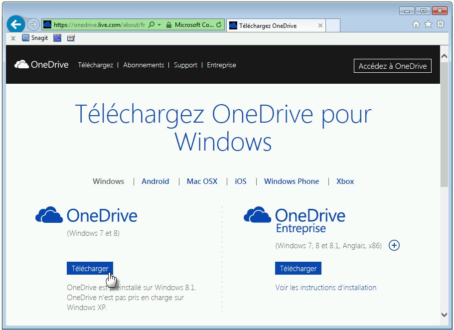 Pour utiliser OneDrive sur Windows Vista, 7 et 8, vous devez installer l’application de bureau. Rendez-vous sur https://onedrive.live.com/about/fr-fr/download/ et cliquez sur Télécharger, sous OneDrive :