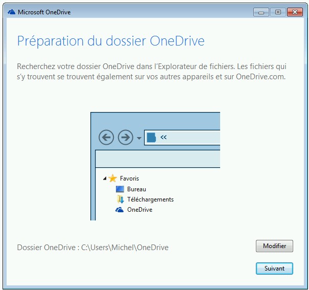 Après avoir cliqué sur Se connecter, vous devez indiquer dans quel dossier seront stockés les fichiers partagés sur OneDrive. Le dossier proposé par défaut est c:\users\nom\OneDrive (où nom est votre nom d’utilisateur) :