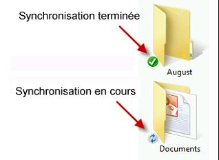 Une marque affichée devant chaque dossier indique si la synchronisation est ou n’est pas terminée :
