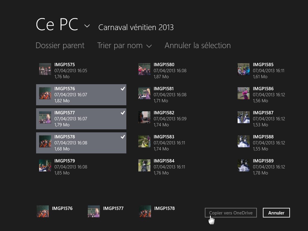 Nous allons ajouter des photos dans le dossier Photos. Un clic sur l’icône Précédent donne accès au dossier racine de OneDrive. Un autre clic sur Photos ouvre ce dossier. Cliquez du bouton droit sur toute partie inutilisée de l’écran pour afficher la barre des applications. Cliquez sur Ajouter fichiers, sélectionnez les photos que vous souhaitez télécharger, puis cliquez sur Copier vers SkyDrive pour les copier dans votre espace SkyDrive.