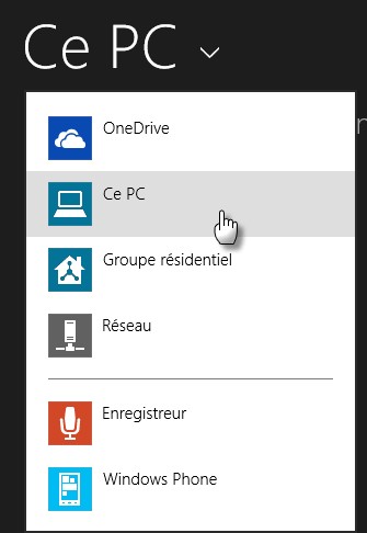 Pour terminer cette rubrique, notez que l’application OneDrive peut être utilisée pour naviguer dans les unités de masse de l’ordinateur. Cliquez sur la vignette OneDrive de l’écran d’accueil, cliquez sur Ce PC dans l’angle supérieur gauche de l’écran puis sélectionnez Ce PC dans la liste. Vous avez alors directement accès à toutes les mémoires de masse de l’ordinateur : disques internes et externes, clés USB, cartes flash, etc.