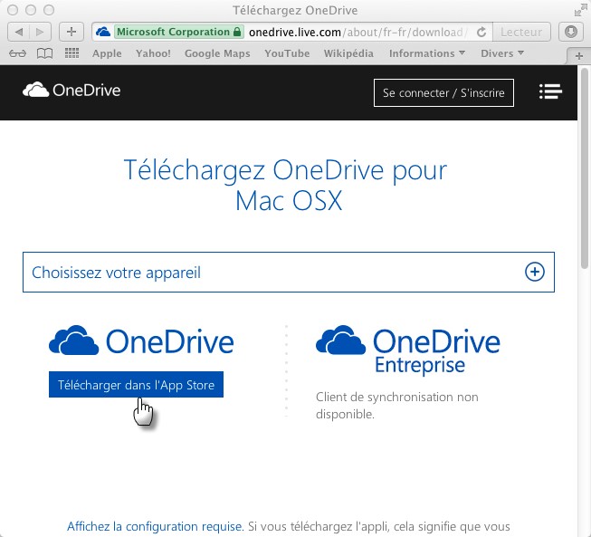 Si votre Mac fonctionne sous OSX 10.7.3 ou ultérieur, rendez-vous sur https://onedrive.live.com/about/fr-fr/download/ et cliquez sur Télécharger, sous OneDrive :