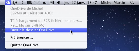 Ca y est, OneDrive est enfin installé. Pour y accéder, cliquez sur l’icône OneDrive dans le coin supérieur droit de l’écran et choisissez Ouvrir le dossier OneDrive dans le menu :