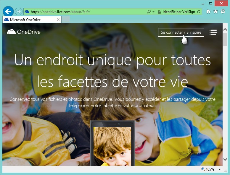 Le site https://onedrive.live.com/ est accessible sur tout ordinateur, mobile ou tablette capable d’accéder au Web. Connectez-vous sur cette adresse, cliquez sur Se connecter/S’inscrire et entrez vos identifiants Microsoft :