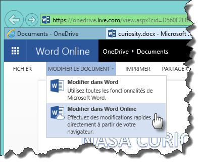 Le menu MODIFIER LE DOCUMENT vous permet de modifier le document en utilisant Word 2013, s’il est installé, ou Word Online dans le cas contraire :