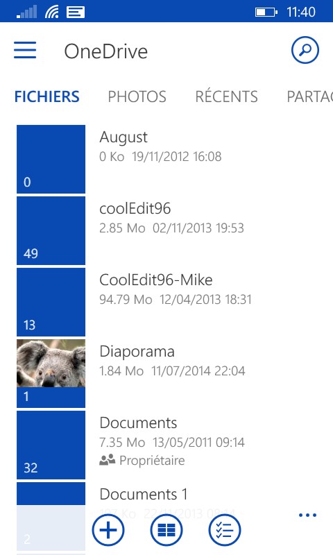 Sur Windows Phone, OneDrive est déjà installé. Il vous suffit de toucher l’icône OneDrive pour accéder à votre espace de stockage :