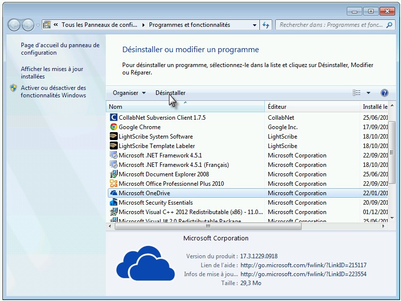 Pour désinstaller OneDrive sous Windows Vista, 7 ou 8, appuyez sur la touche Windows, tapez désinstaller et cliquez sur Désinstaller un programme. Dans la fenêtre Programmes et fonctionnalités, cliquez sur OneDrive puis sur Désinstaller :