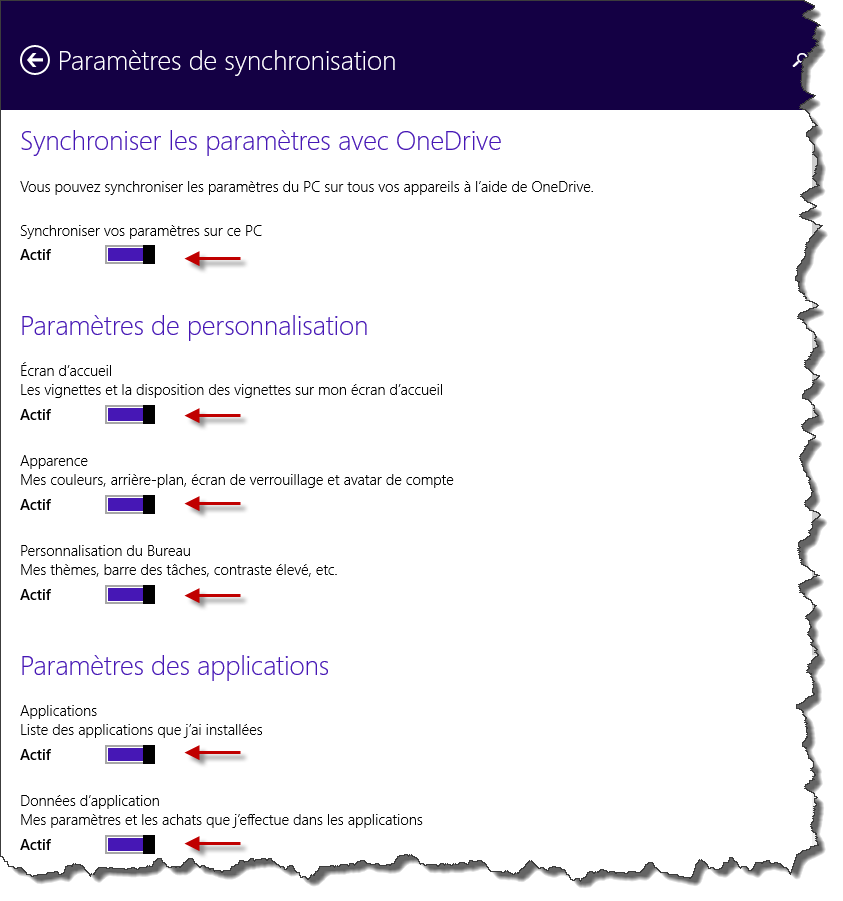 OneDrive fait partie de Windows 8.1 et supérieur. Plutôt que de le désinstaller, je vous conseille d’arrêter toute synchronisation si vous ne voulez plus l’utiliser. Appuyez simultanément sur les touches Windows et C, cliquez sur Paramètres puis sur Modifier les paramètres du PC. Sélectionnez OneDrive dans le volet gauche, puis Paramètres de synchronisation dans ce même volet. Il ne vous reste plus qu’à basculer tous les interrupteurs vers la gauche dans cet écran puis de refermer la fenêtre pour ne plus utiliser OneDrive :