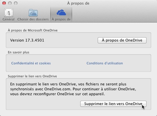 Une boîte de dialogue s’affiche. Basculez sur l’onglet A propos et cliquez sur Supprimer le lien vers OneDrive :