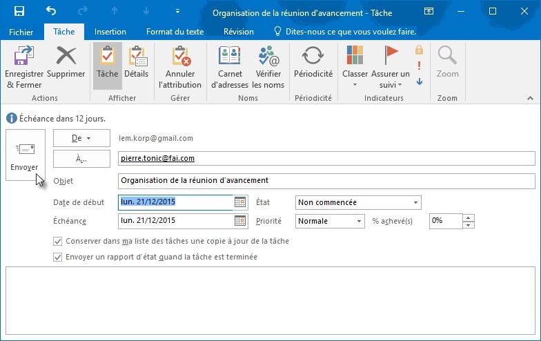 Pour attribuer une nouvelle tâche à une autre personne, cliquez sur l’icône Tâches dans la barre de navigation, puis sur l’icône Nouvelle tâche, sous l’onglet Accueil, dans le groupe Nouveau du ruban. Dans la fenêtre Tâche, cliquez sur l’icône Affecter une tâche, dans le groupe Gérer. Définissez les paramètres demandés dans la fenêtre Tâche et cliquez sur Envoyer pour attribuer la nouvelle tâche.