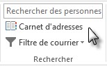Le module Courrier étant sélectionné dans la barre de navigation, cliquez sur l’icône Carnet d’adresses, dans le groupe Rechercher, sous l’onglet Accueil du ruban.