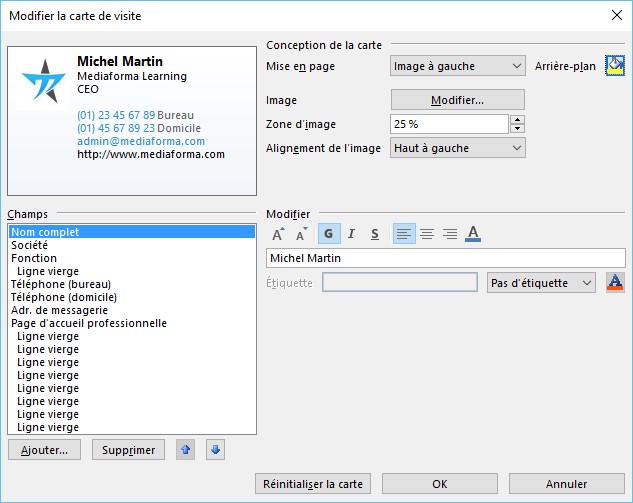 Lorsque la carte de visite a l’allure souhaitée, cliquez sur OK, puis sur Enregistrer et fermer.