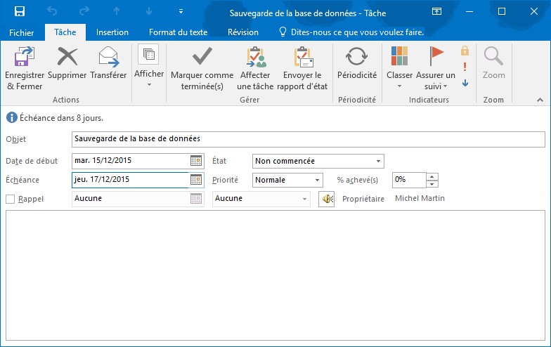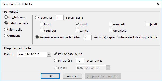 Pour créer une tâche qui se répète à intervalles réguliers, cliquez sur l’icône Tâches dans la barre de navigation, puis sur l’icône Nouvelle tâche, sous l’onglet Accueil, dans le groupe Nouveau du ruban. Dans la zone Objet, tapez le nom de la tâche. Sélectionnez les options dont vous avez besoin. Cliquez sur l’icône Périodicité dans le groupe de même nom et définissez la périodicité de la tâche. Ici par exemple, la sauvegarde de la base de données doit se faire toutes les semaines, le Vendredi. Aucune date de fin n’est prévue. Cliquez sur OK puis sur l’icône Enregistrer & fermer.