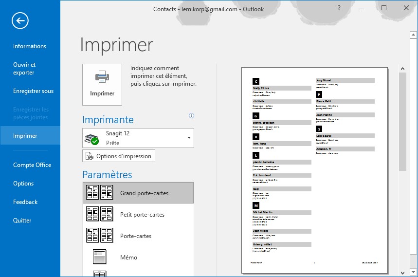 Cliquez sur l’icône Contacts dans la barre de navigation, basculez sur l’onglet Fichier dans le ruban, puis cliquez sur Imprimer.