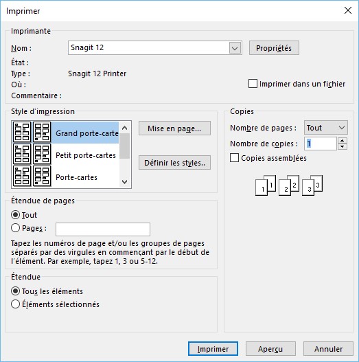 Cliquez sur Options d’impression. Cette action affiche la boîte de dialogue Imprimer. Ici, vous pouvez choisir l’imprimante à utiliser, les pages à imprimer et le nombre de copies. Dans le cas d’une impression multiple, cochez la case Copies assemblées si vous souhaitez imprimer des jeux de copies séparés. Choisissez un style d’impression dans le groupe Style d’impression.