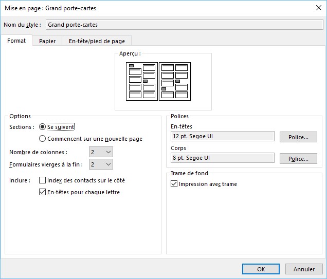 Si nécessaire, cliquez sur Mise en page pour préciser la façon dont les contacts seront imprimés :
